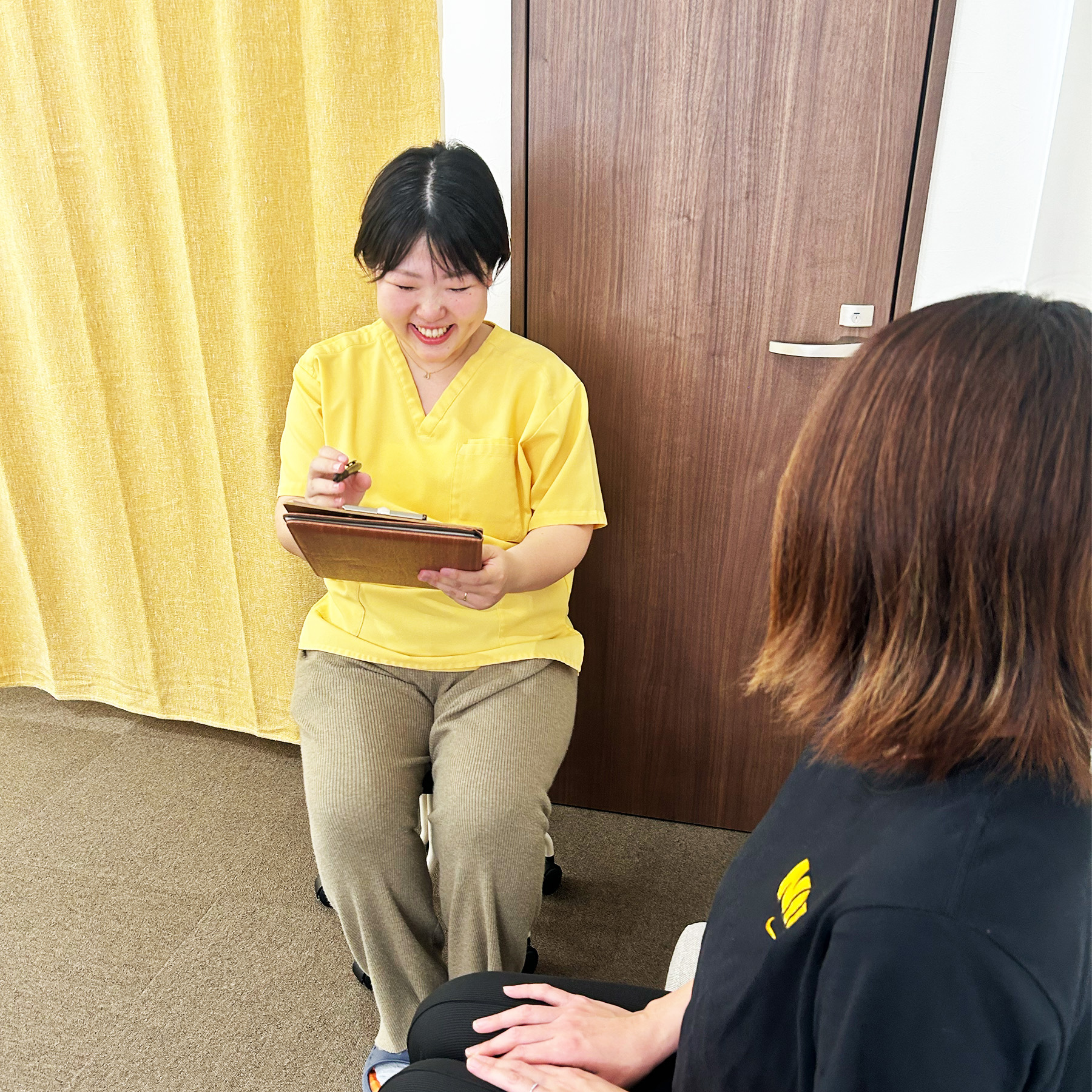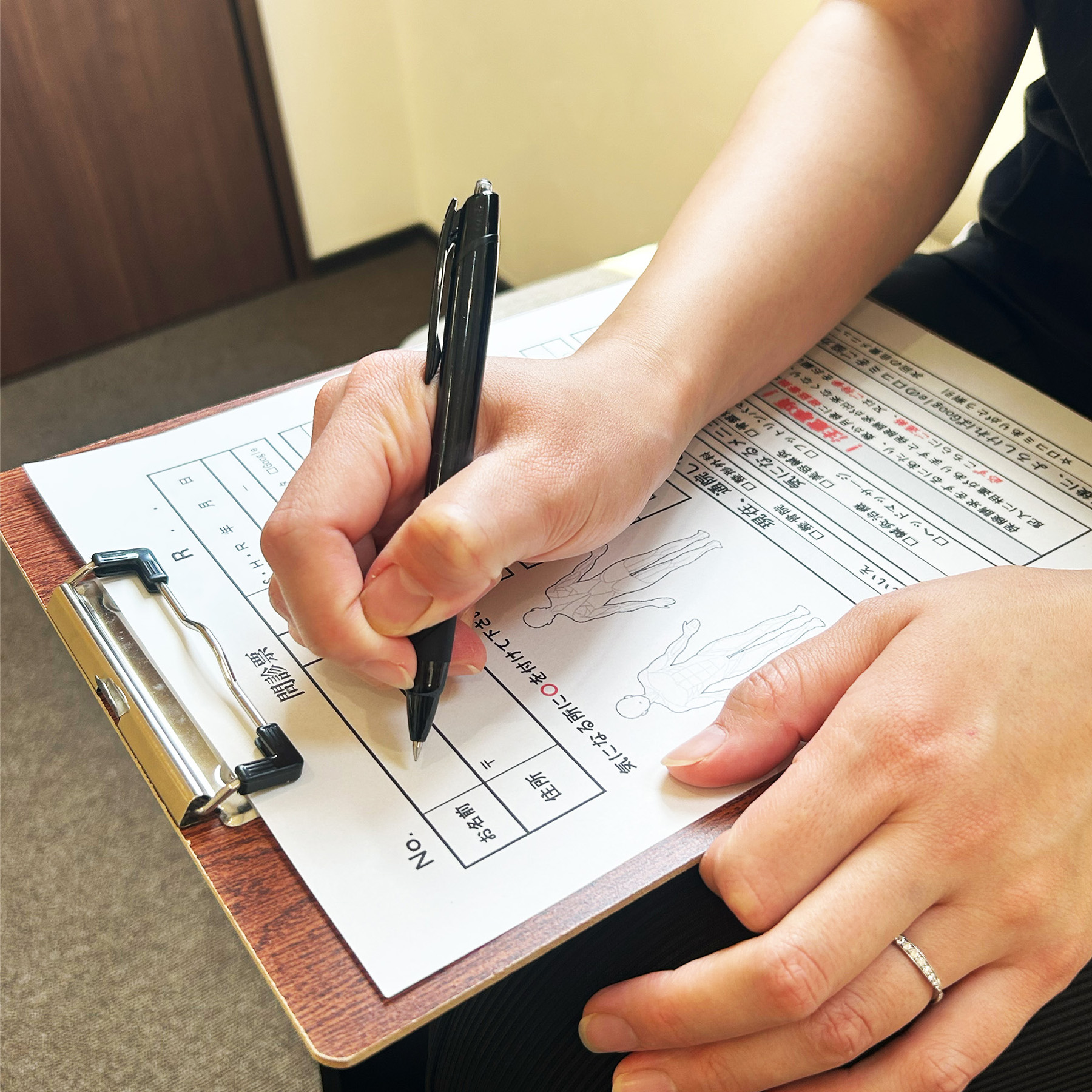 笑顔でお迎えし、リラックスして いただけるようご案内します。問 診票にお身体の気になるところを ご記入ください。